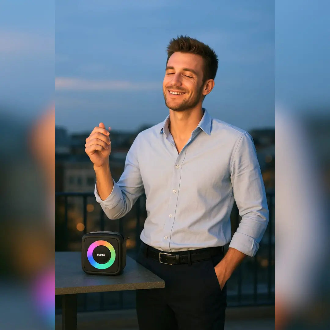 ek stylish portable Bluetooth speaker hai jo deep bass, HD stereo sound aur RGB lights ke saath aapke music ka maza double karta hai. Compact aur waterproof design ke saath ye indoor aur outdoor dono gatherings ke liye best choice hai.